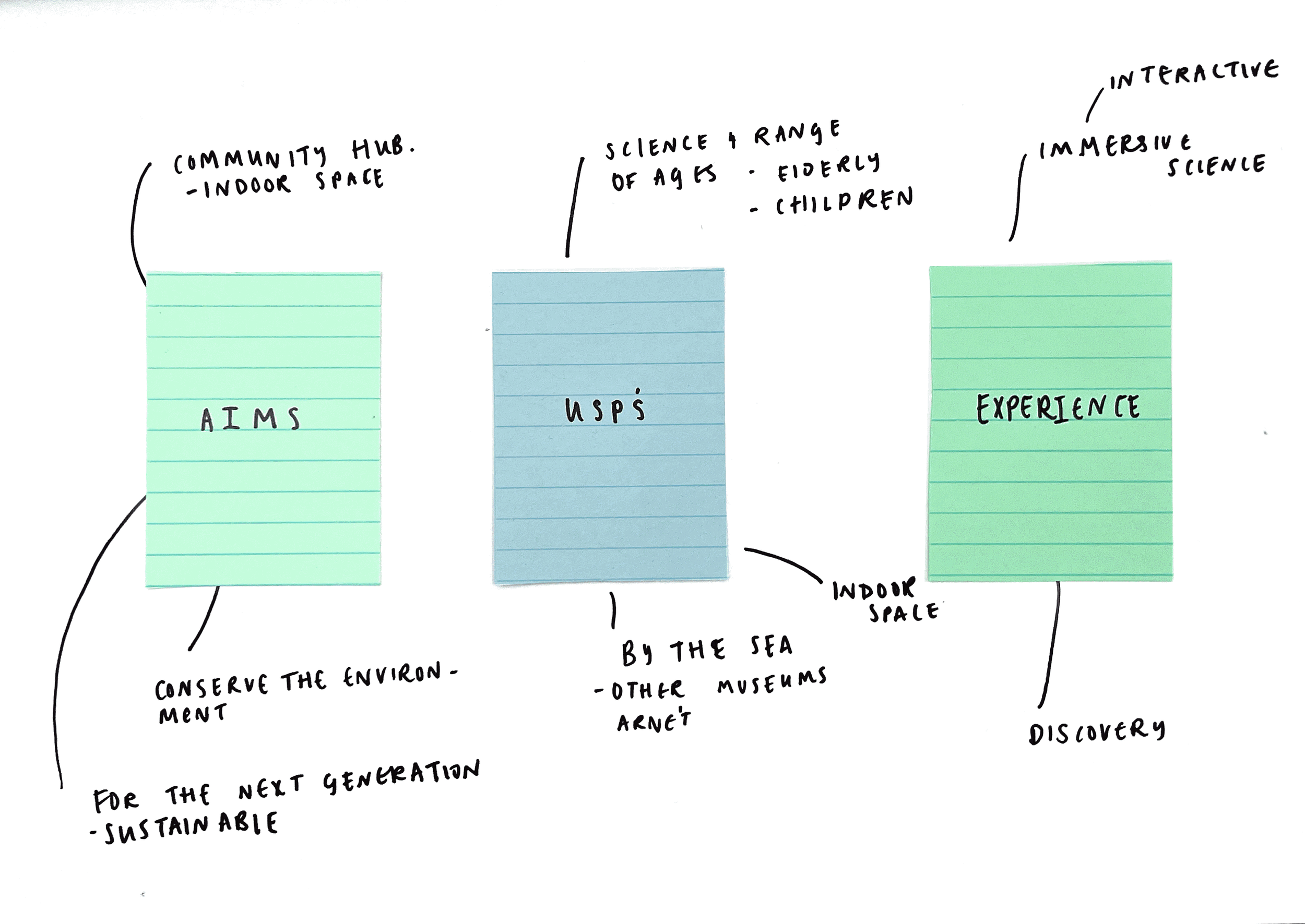 We decided to start the process by separately coming up with different initial ideas based upon the key aims of the museum.